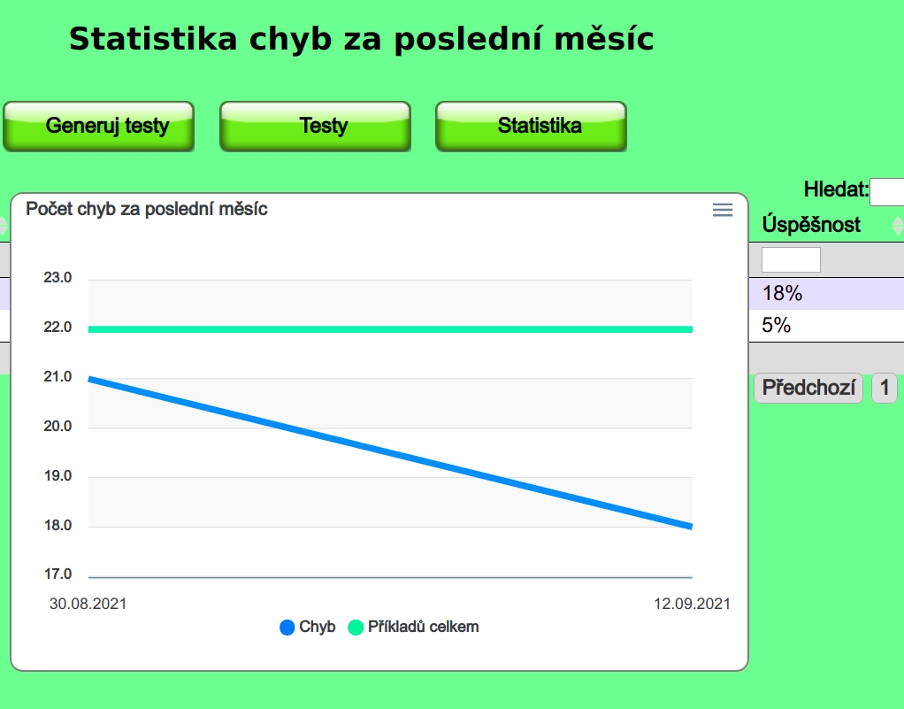 Modul pro statistiku chyb za poslední měsíc. Grafy. Možnost generování testů z příkladů, ve kterých byly obsaženy chyby.
